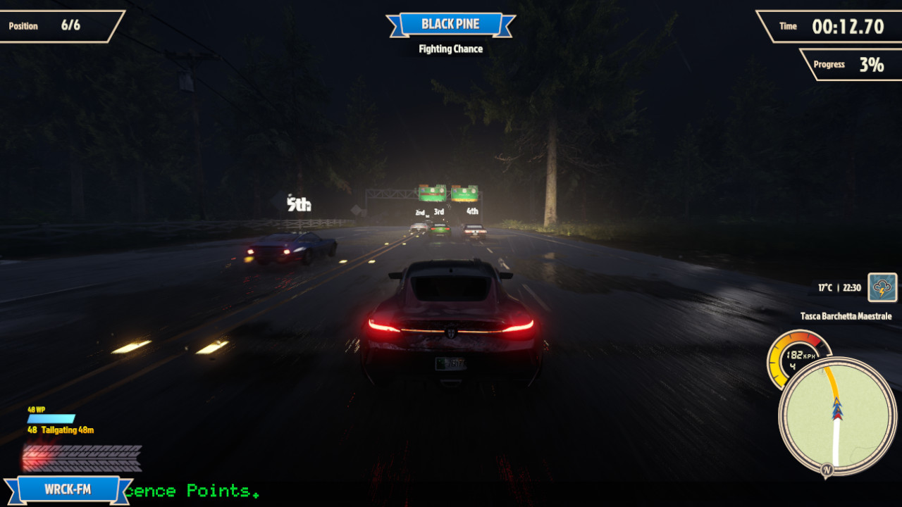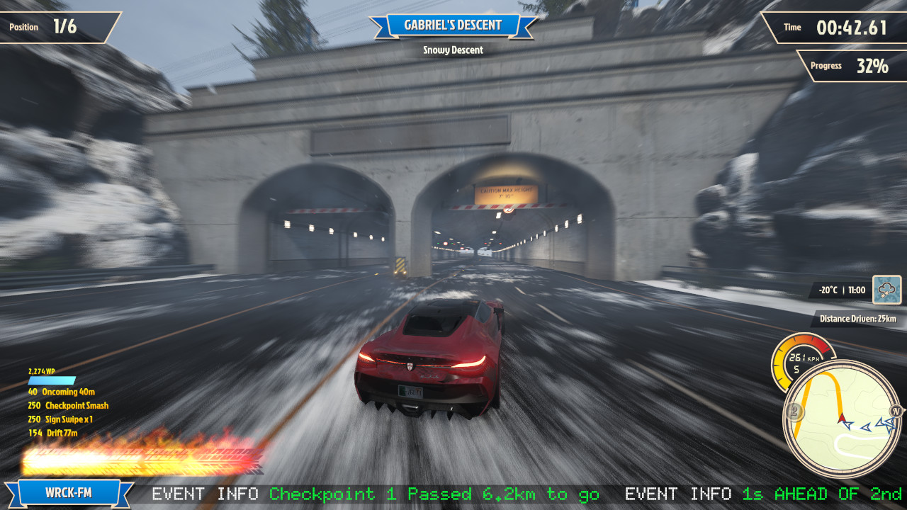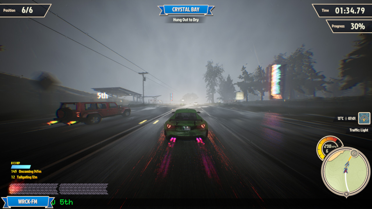 Il titolo fa incredibilmente bene ciò che un videogame corsistico arcade deve azzeccare. Ha un gameplay semplice ma altrettanto dinamico e soddisfacente. Come dicevo, la sensazione di velocità veicolata da Wreckreation è senza eguali nel panorama odierno e la scarica di adrenalina che ne consegue è davvero esaltante. I tracciati sono disegnati in modo da assecondare intelligentemente il sistema di guida che premia notevolmente curve ampie dove poter derapare. L’IA che governa i (pochi) avversari è combattiva il giusto e, come ai tempi di Burnout, rende esaltante i testa a testa più agguerriti.