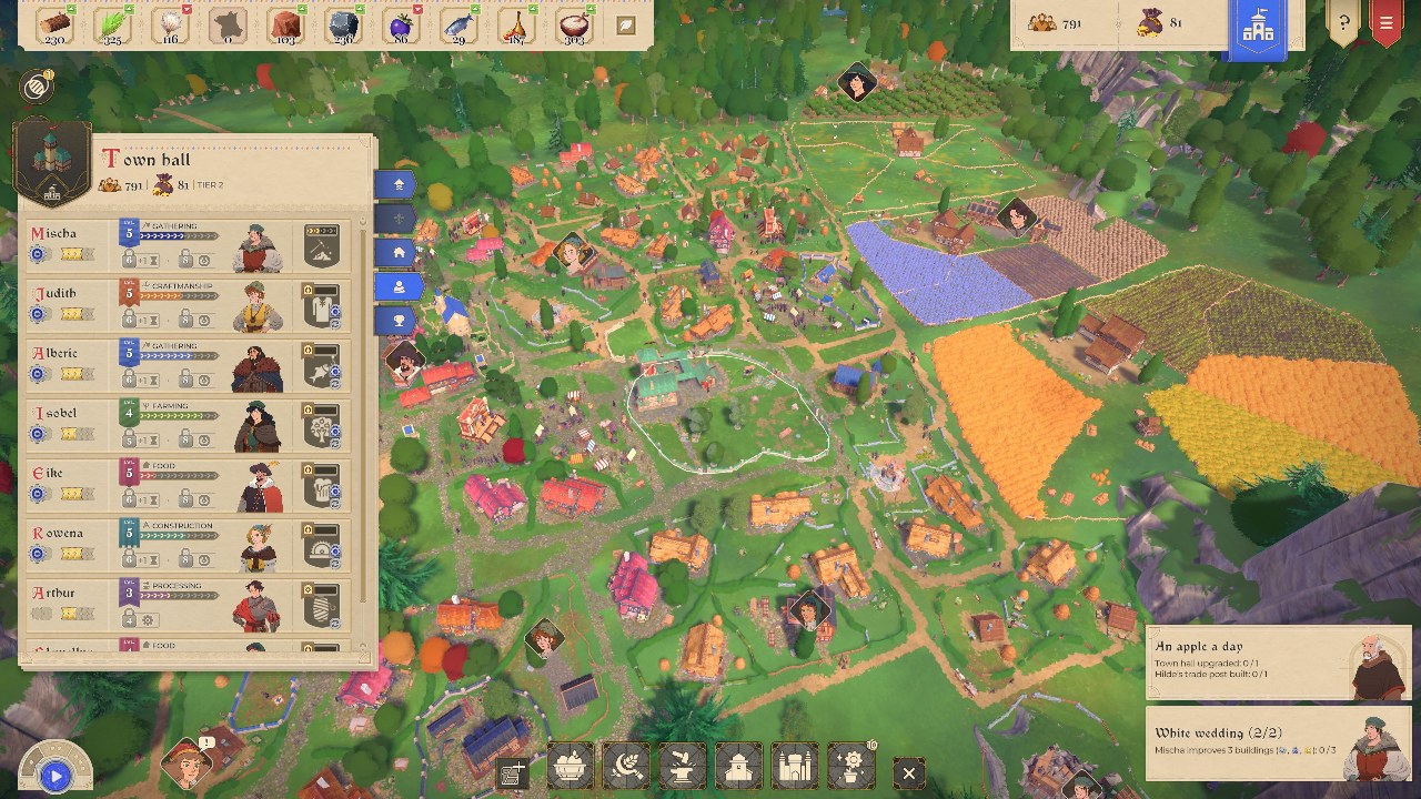 Chiaramente non è tutto qui: avrai edifici che produrranno risorse, e potrai stabilire delle catene produttive (un po’ come in Anno, ma un po’ più semplice), per fornire alla città tutto ciò di cui necessita. Ad aiutarti nel compito di gestire questa produzione avrai al tuo fianco dei personaggi, ben nove che, man mano che svolgono un’attività, guadagnano livelli diventando sempre più esperti in quello che fanno. Questi personaggi sono un’altra piccola novità di cui City Tales – Medieval Era si fa vanto, e in effetti è una caratteristica che mi è piaciuta molto, perché non si tratta dei soliti NPC piatti e generici, ma di “amici” dei quali dovrai anche risolvere delle piccole quest secondarie.