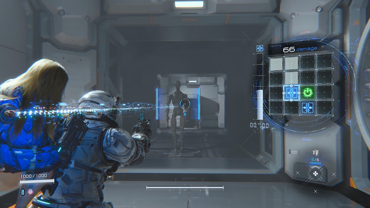 Attivare l’hacking sovrappone al bersaglio una griglia di nodi colorati nel momento in cui lo prendi di mira con la tua arma: devi tracciare un percorso collegando i nodi potenzianti (più danni, più durata della finestra di vulnerabilità, effetti di stato) fino al nodo finale di esecuzione, tutto mentre i nemici continuano a muoversi, sparare e cercare di farti a pezzi. La finestra di vulnerabilità che si apre una volta completata la griglia è il momento in cui scarichi tutto su quel povero robot e, se hai costruito bene il percorso, lo guardi esplodere in mille detriti soddisfacenti.