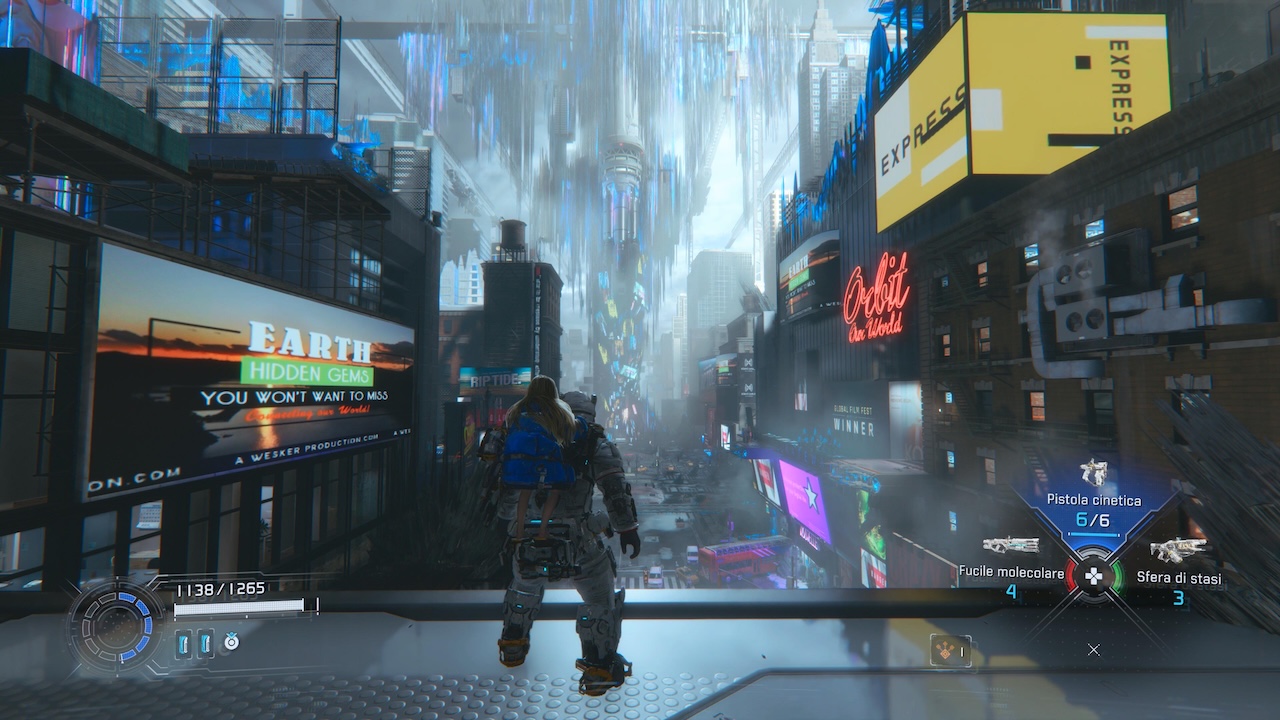 Su PS5 Pro, Pragmata è un piccolo spettacolo tecnico. Il RE Engine torna a fare quello che sa fare meglio – illuminazione globale convincente, superfici materiche e dettagliatissime, animazioni fluide – questa volta in un contesto che per certi versi è più “silenzioso” di un classico horror Capcom, ma non meno elaborato. La stazione lunare è un personaggio “vivente” a tutti gli effetti: corridoi sterili che si alternano a hangar devastati, cupole trasparenti dove la Terra fa capolino nel buio cosmico, moduli ghiacciati, stanze di ricerca abbandonate che raccontano la storia di quello che è successo senza una riga di dialogo. Ogni area ha una sua tavolozza cromatica riconoscibile, e la direzione artistica mantiene una coerenza stilistica che impressiona. Incredibile la riproduzione di New York, vedere per credere.
